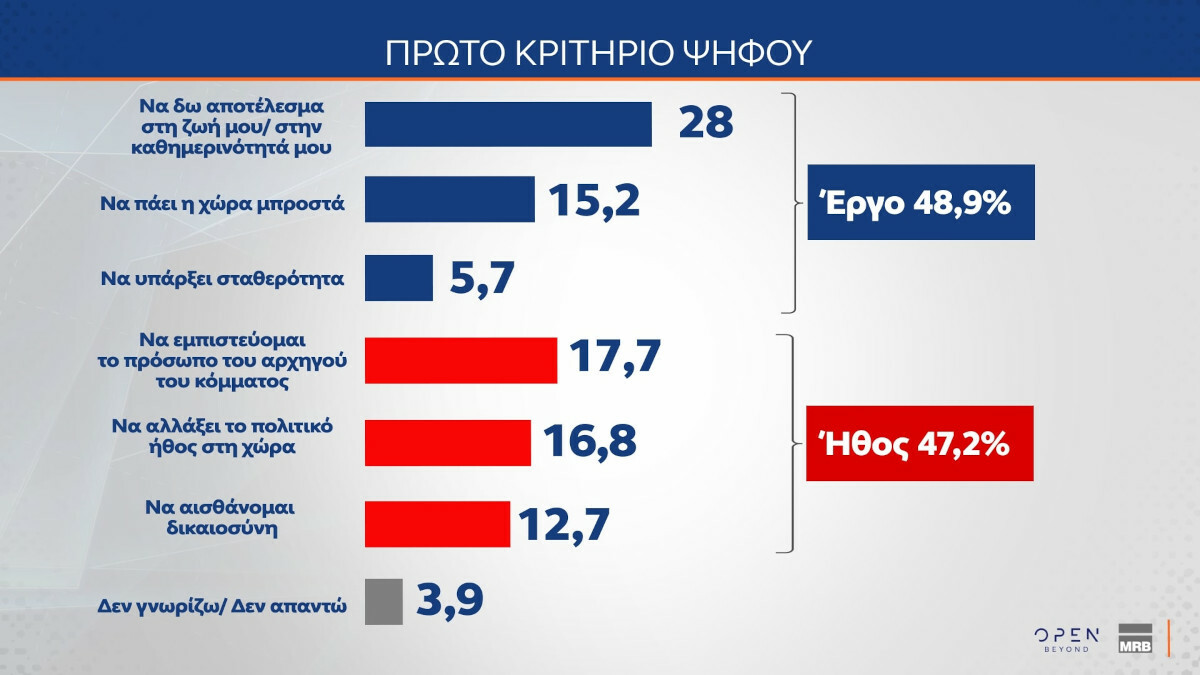 Το 48,9% όσων συμμετείχαν στη δημοσκόπηση ζητά έργο και αποτέλεσμα, ενώ το 47,2% αλλαγή πολιτικής ηθικής.