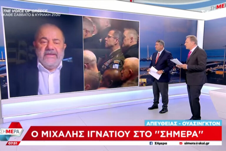 Ο Μιχάλης Ιγνατίου, αναλυτής του Σκάι στην Ουάσιγκτον και αρθρογράφος και ανταποκριτής της Hellas Journal στον Λευκό Οίκο, με τον Δημήτρη Οικονόμου και τον Ακη Παυλόπουλο. Φωτογραφία από βίντεο, SKAI News