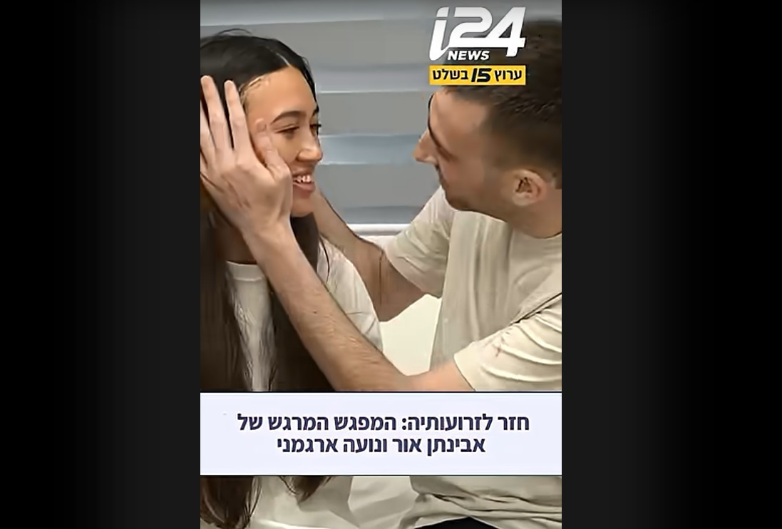 Σε βίντεο που είδε το φως της δημοσιότητας, η διασωθείσα όμηρος Νόα Αργκαμάνι και ο σύντροφός της, Αβινατάν Ορ, χαμογελούν, αγκαλιάζονται και στη συνέχεια φιλιούνται, αδυνατώντας να κρύψουν τη χαρά τους.
